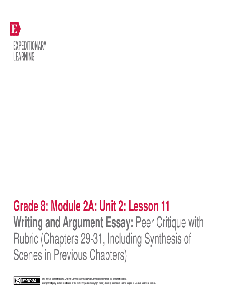 Grade 8: Module 2A: Unit 2: Lesson 11 Writing and Argument Essay: Peer Critique with Rubric (Chapters 2931, Including Synthesis of Scenes in Previous Chapters) This work is licensed under a Creative