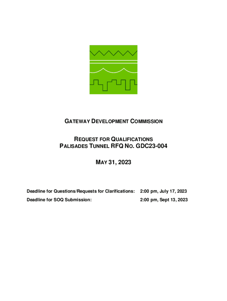 GATEWAY DEVELOPMENT COMMISSION REQUEST FOR QUALIFICATIONS PALISADES TUNNEL RFQ NO. GDC23004 MAY 31, 2023Deadline for Questions/Requests for Clarifications:2:00 pm, July 17, 2023Deadline for SO Submission:2:00