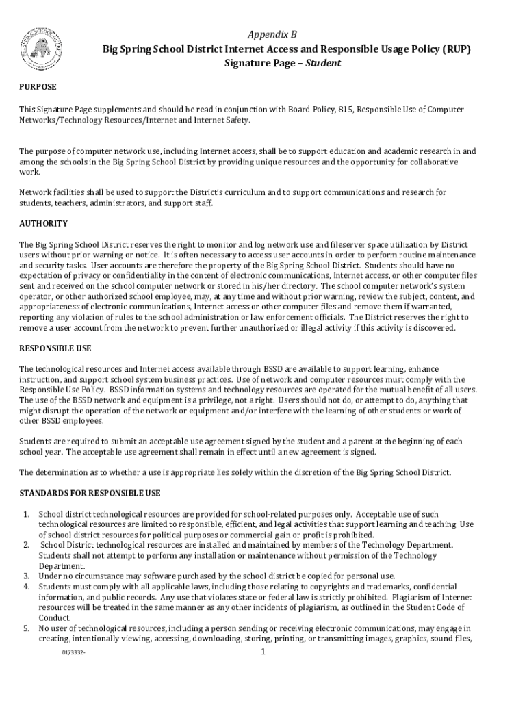 Appendix B Big Spring School District Internet Access and Responsible Usage Policy (RUP) Signature Page Student PURPOSE This Signature Page supplements and should be read in conjunction with Board