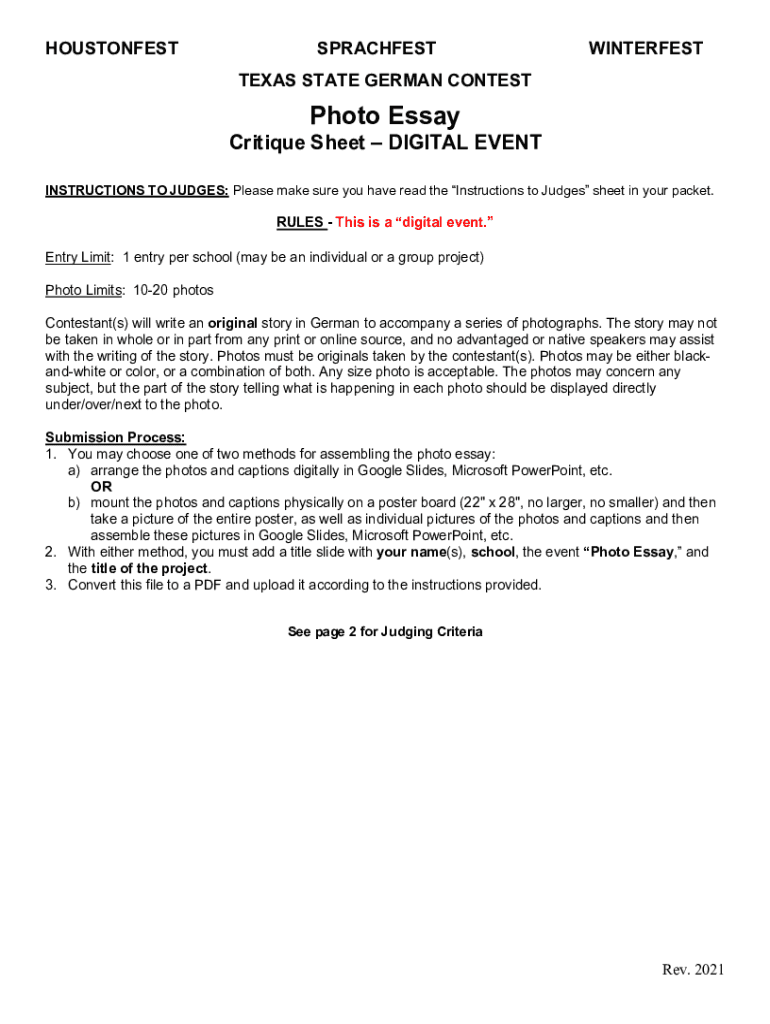 HOUSTONFESTSPRACHFESTWINTERFESTTEXAS STATE GERMAN CONTESTPhoto Essay Critique Sheet DIGITAL EVENT INSTRUCTIONS TO JUDGES: Please make sure you have read the Instructions to Judges sheet in your packet.