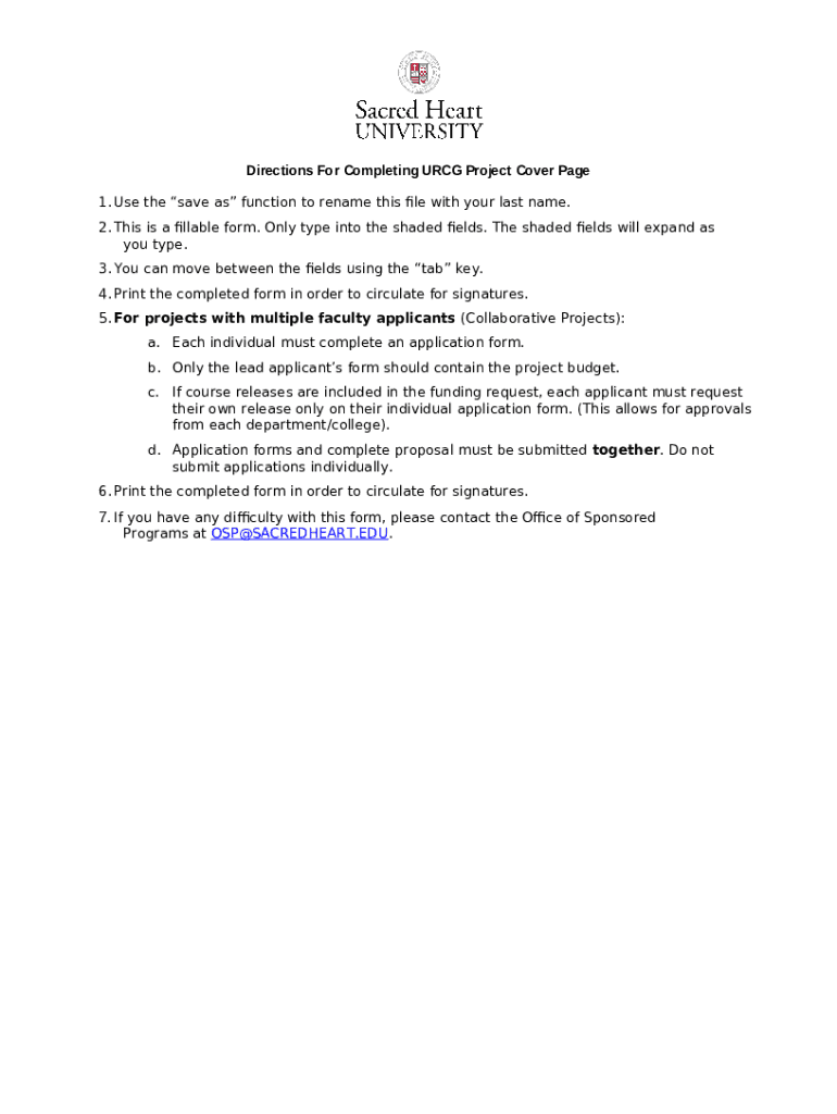 The Directions For Completing URCG Project Cover Page is a document that should be submitted to the specific address to provide certain info. It must be filled-out and signed, which is possible manually, or via a particular software e. g. PDFfiller. This tool helps to fill out any PDF or Word document right in the web, customize it according to your needs and put a legally-binding e-signature. Right away after completion, user can easily send the Directions For Completing URCG Project Cover Page to the relevant recipient, or multiple recipients via email or fax. The editable template is printable too because of PDFfiller feature and options offered for printing out adjustment. In both digital and in hard copy, your form will have got neat and professional outlook. It's also possible to turn it into a template for further use, so you don't need to create a new file over and over. You need just to amend the ready document.