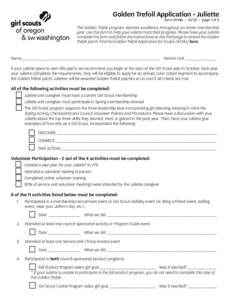 Get the free Golden Trefoil Application - Juliette (form 134b). Want to complete the Golden Trefo...