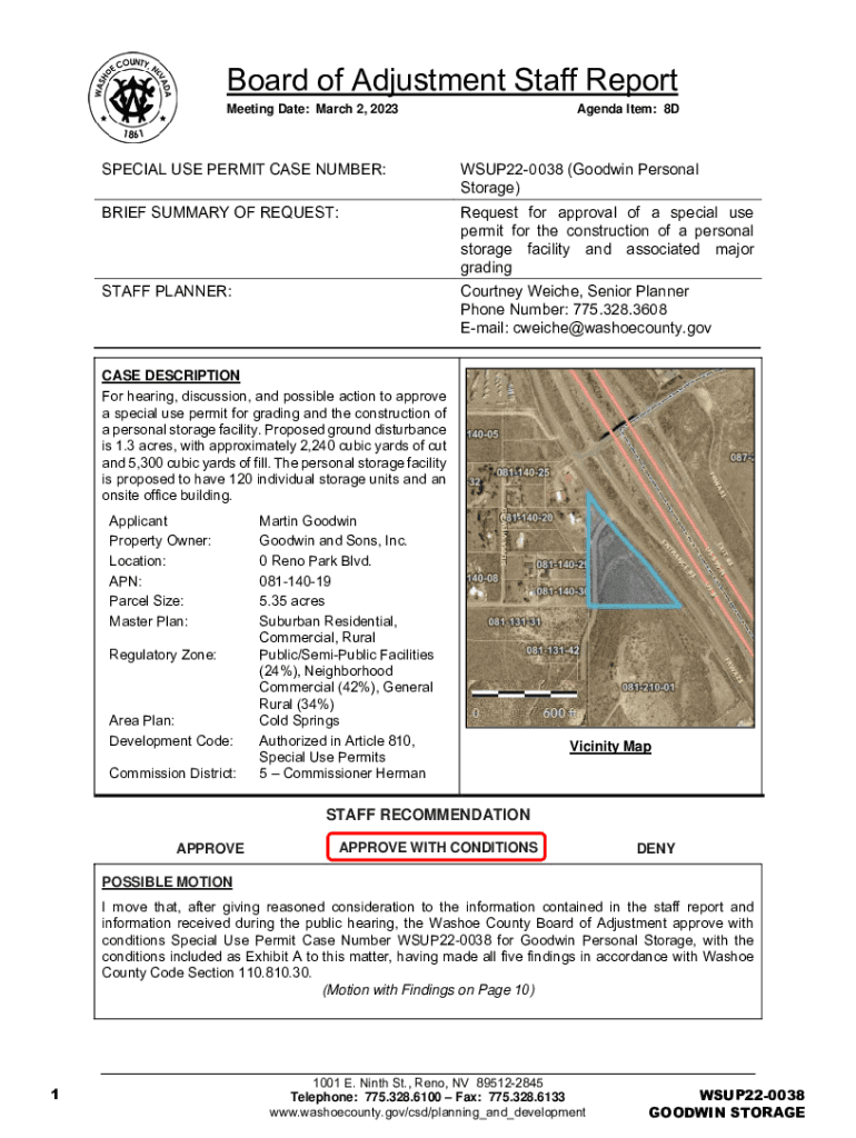 Board of Adjustment Staff Report Meeting Date: March 2, 2023Agenda Item: 8DSPECIAL USE PERMIT CASE NUMBER:WSUP220038 (Goodwin Personal Storage)BRIEF SUMMARY OF REQUEST:Request for approval of a special