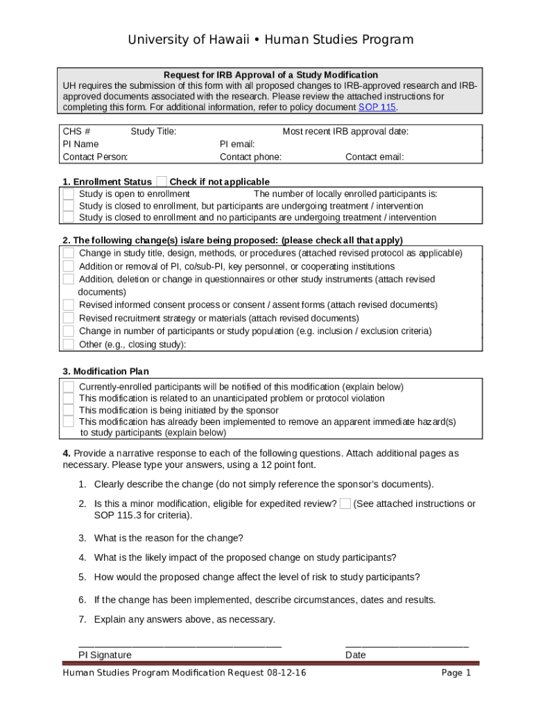 Instructions for the form All changes to an IRB-approved research project and the documents approved by the IRB to implement the research project require submission of this to the CHS