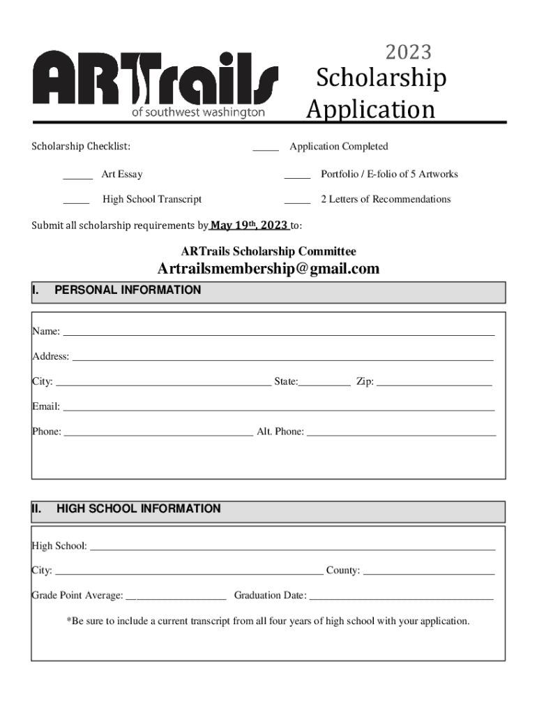2023Scholarship Application Scholarship Checklist:___Application Completed___ Art Essay___Portfolio / Folio of 5 Artworks______2 Letters of RecommendationsHigh School TranscriptSubmit all scholarship