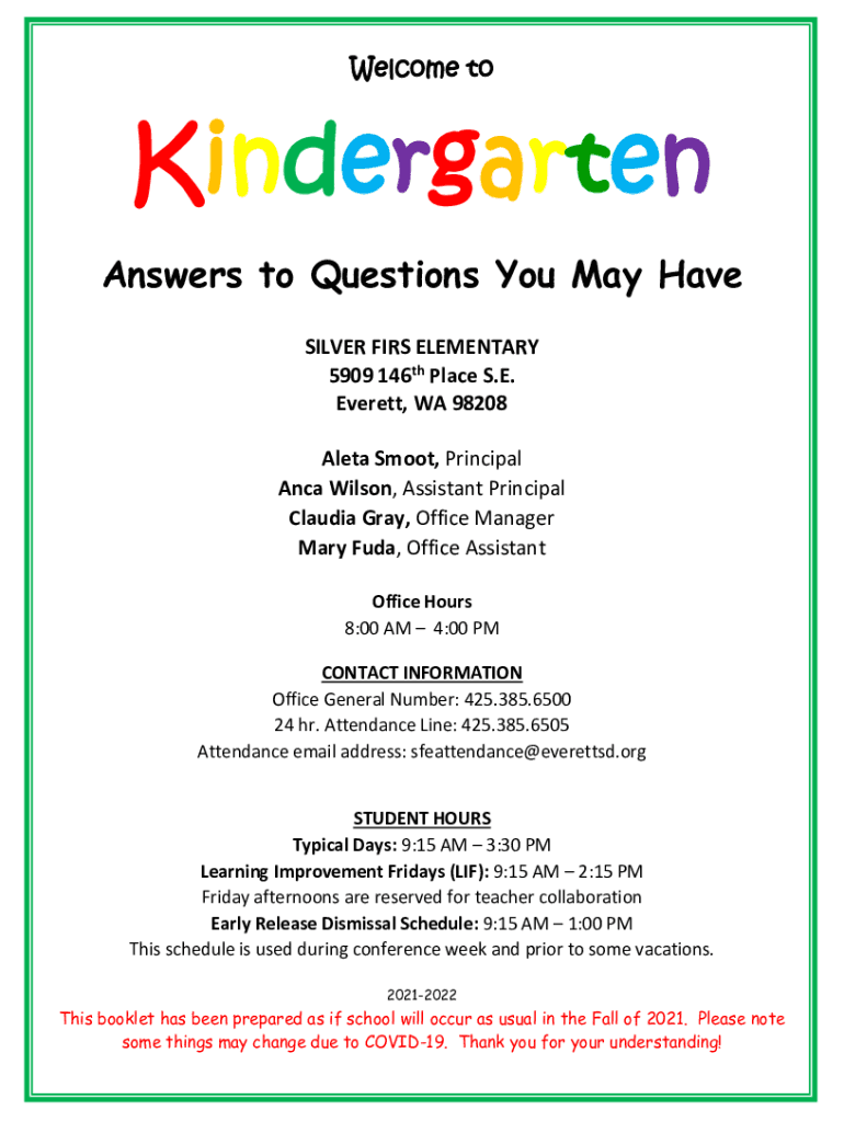Welcome kindergarten Answers to Questions You May Have SILVER FIRS ELEMENTARY 5909 146th Place S.E. Everett, WA 98208 Alta Shoot, Principal Anna Wilson, Assistant Principal Claudia Gray, Office Manager
