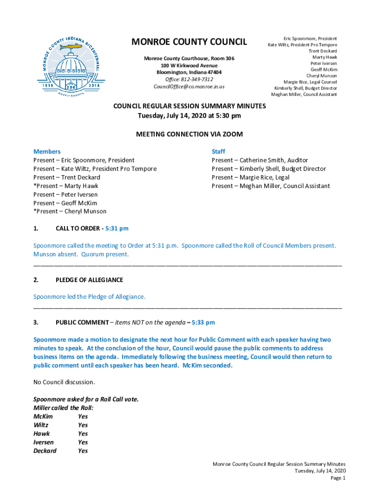 MONROE COUNTY COUNCIL Monroe County Courthouse, Room 306 100 W Kirkwood Avenue Bloomington, Indiana 47404 Office: 8123497312 CouncilOffice@co.monroe.in.usEric Spoon more, President Kate Waltz, President