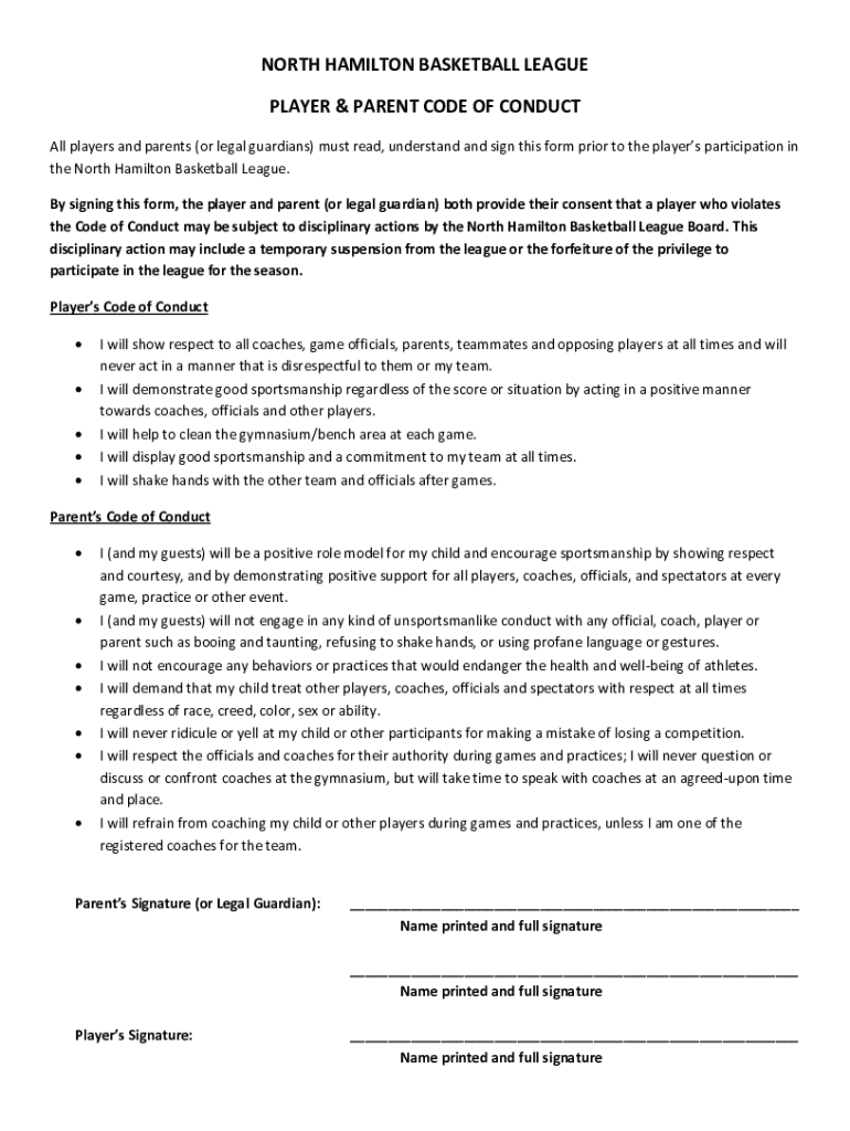 NORTH HAMILTON BASKETBALL LEAGUE PLAYER & PARENT CODE OF CONDUCT All players and parents (or legal guardians) must read, understand and sign this form prior to the players' participation in the North