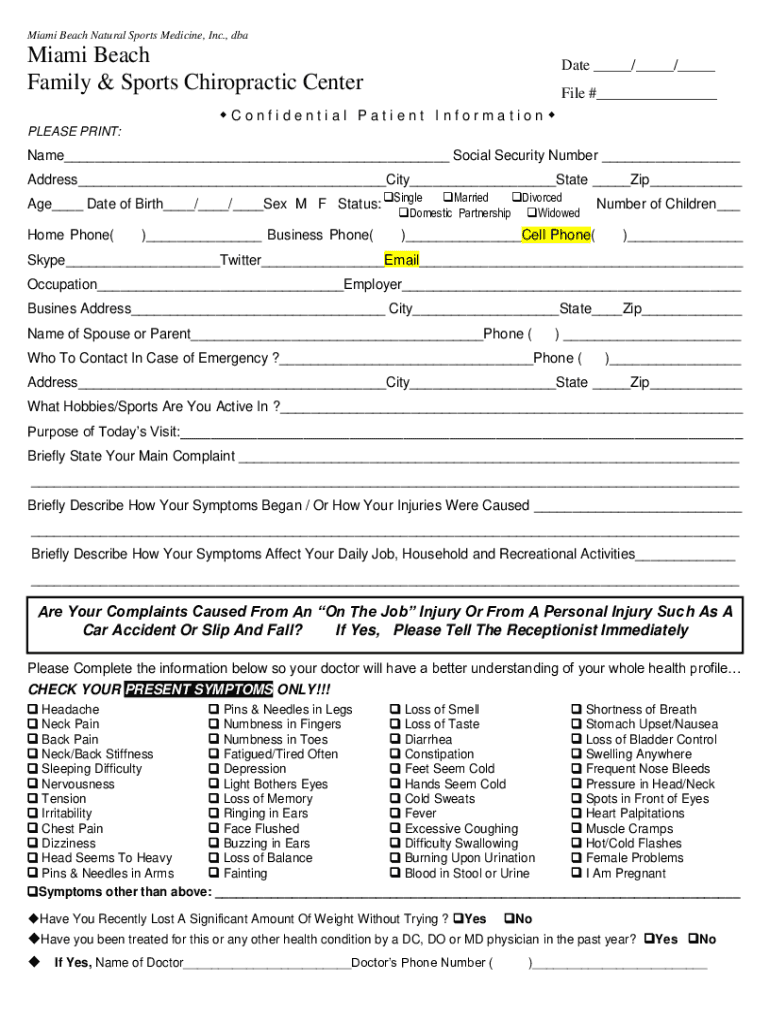 Miami Beach Natural Sports Medicine, Inc., Tamiami Beach Family & Sports Chiropractic Generate ___/___/___File #___ C o n f i d e n t i an l P a t i e n t I n f o r m a t i o n PLEASE PRINT:Name___