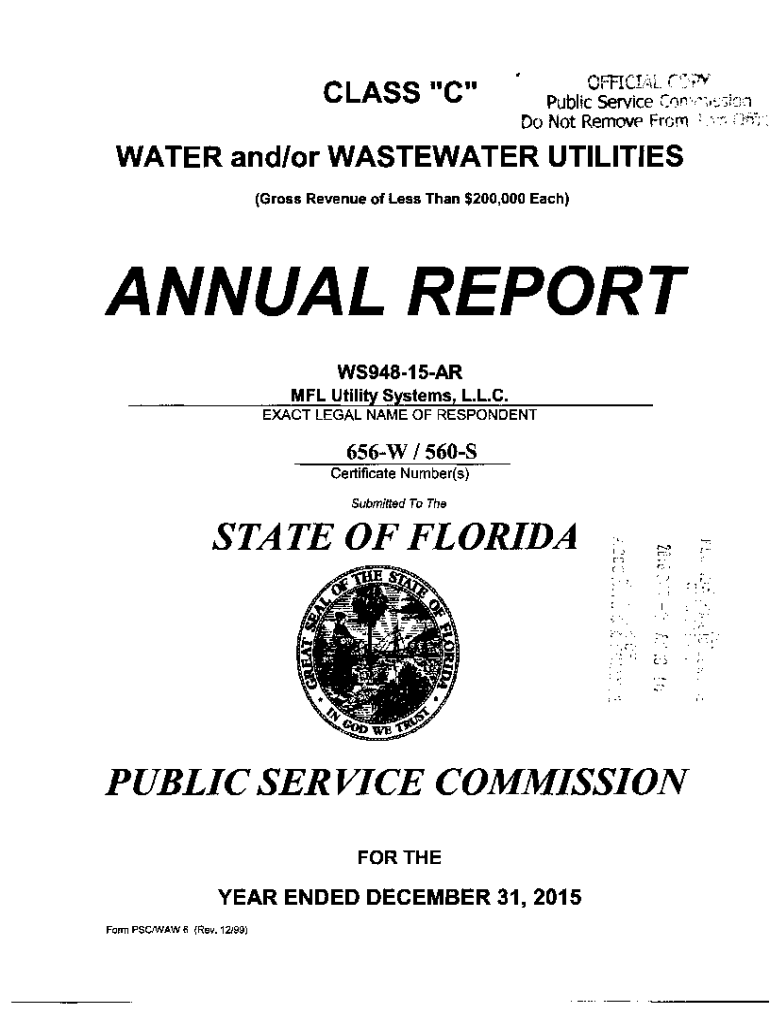 CLASS \” C\”. IC\'\” T.!.o;I...r OFF IRR.by \”\” Public Service C0nr\”\'\', ;;::;k;n Do Not Remove From : : \”\'; (J\'1::.\'WATER and/or WASTEWATER UTILITIES (Gross Revenue of Less Than