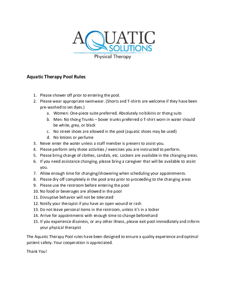 Aquatic Therapy Pool Rules 1. Please shower off prior to entering the pool. 2. Please wear appropriate swimwear. (Shorts and Shirts are welcome if they have been rewashed to set dyes.) a. Women: One