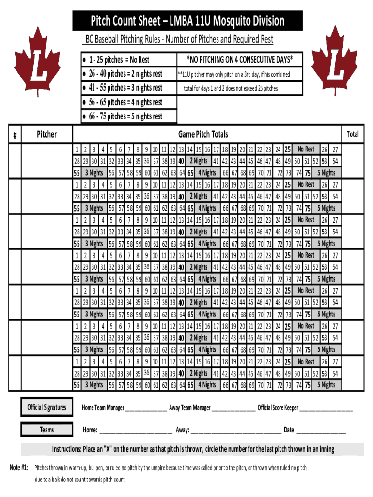 Get the free Pitch Count Sheet LMBA 11U Mosquito Division