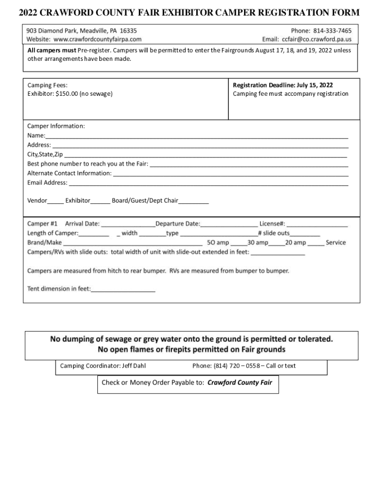 2022 CRAWFORD COUNTY FAIR EXHIBITOR CAMPER REGISTRATION Formal campers must Preregister. Campers will be permitted to enter the Fairgrounds August 17, 18, and 19, 2022 unless other arrangements have