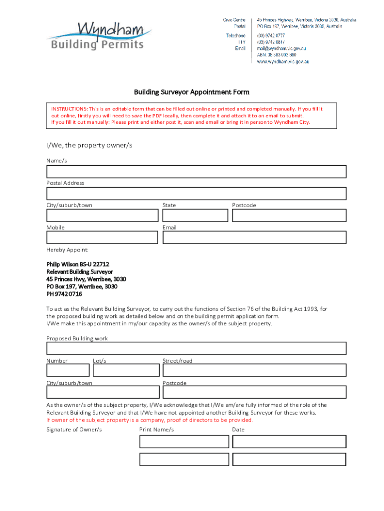 Building Surveyor Appointment Form INSTRUCTIONS: This is an editable form that can be filled out online or printed and completed manually. If you fill it out online, firstly you will need to save