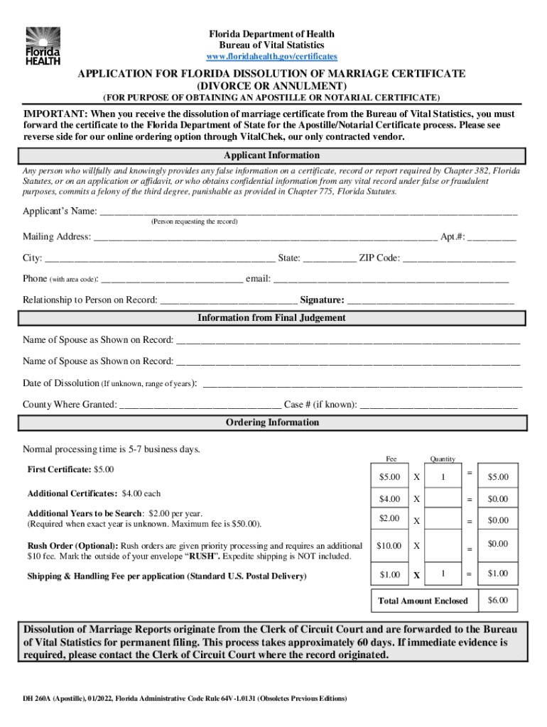 Florida Department of Health Bureau of Vital Statistics www.floridahealth.gov/certificatesAPPLICATION FOR FLORIDA DISSOLUTION OF MARRIAGE CERTIFICATE (DIVORCE OR ANNULMENT) (FOR PURPOSE OF OBTAINING