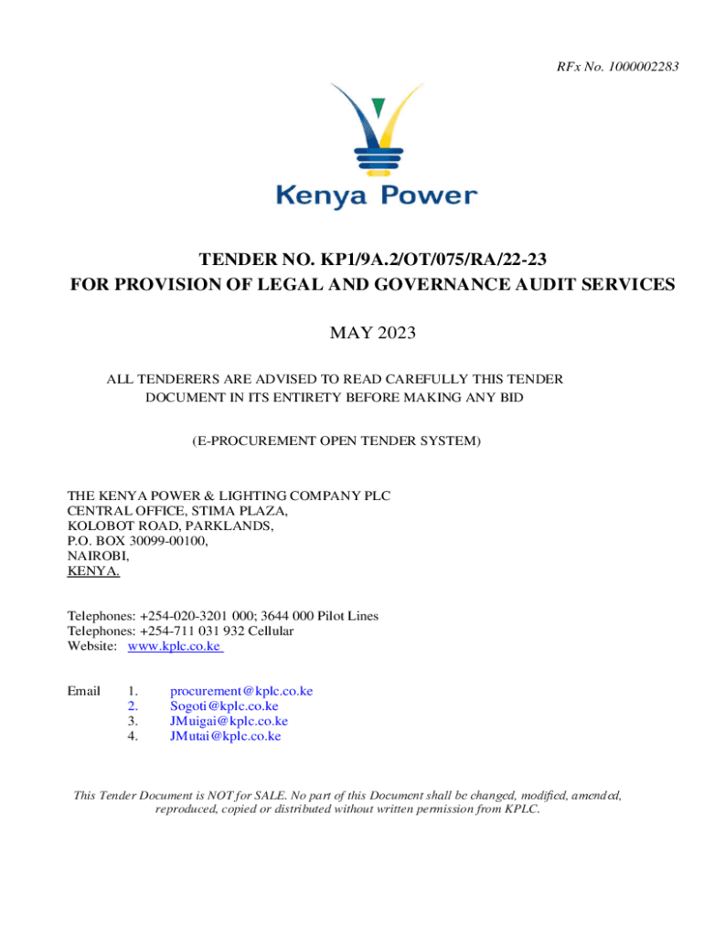 Rex No. 1000002283TENDER NO. KP1/9A.2/OT/075/RA/2223 FOR PROVISION OF LEGAL AND GOVERNANCE AUDIT SERVICES MAY 2023 ALL TENDERER ARE ADVISED TO READ CAREFULLY THIS TENDER DOCUMENT IN ITS ENTIRETY BEFORE