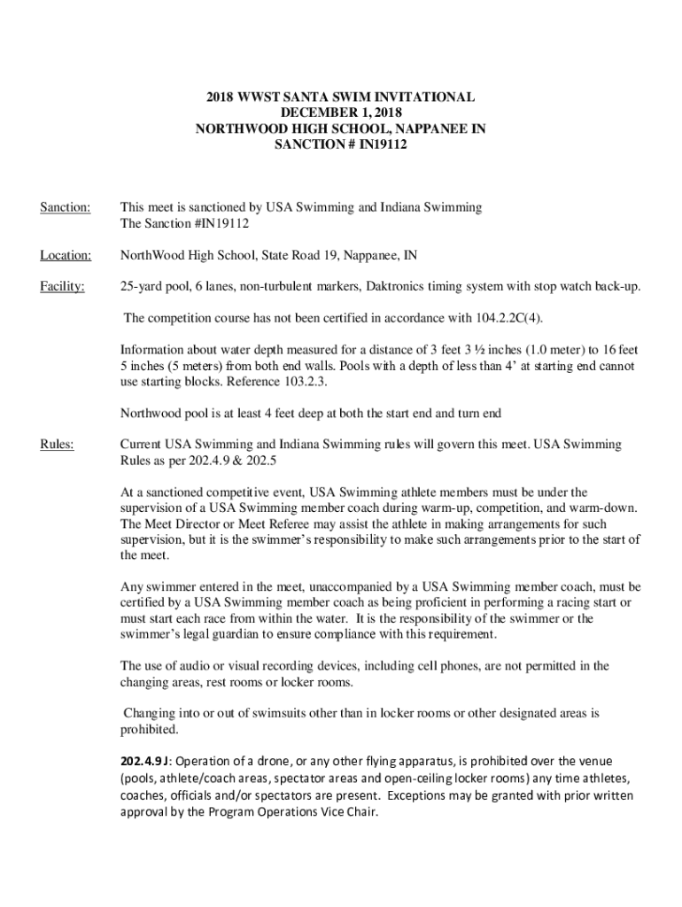2018 WEST SANTA SWIM INVITATIONAL DECEMBER 1, 2018, NORTHWARD HIGH SCHOOL, JAPANESE IN SANCTION # IN19112Sanction:This meet is sanctioned by USA Swimming and Indiana Swimming The Sanction #IN19112Location:North