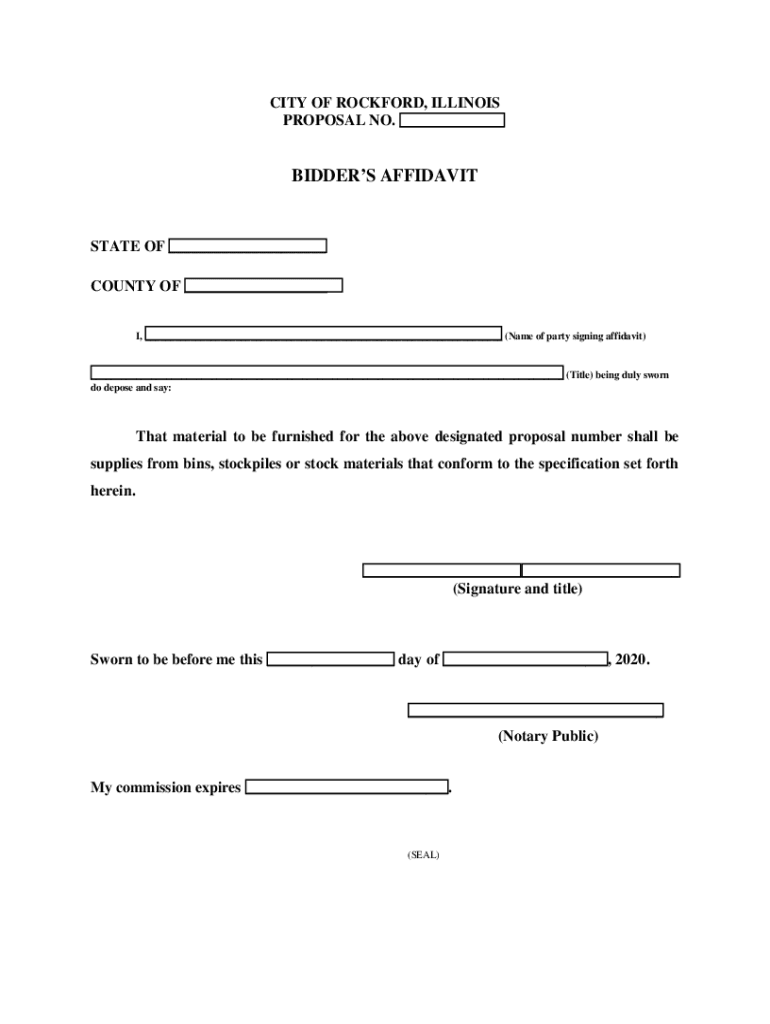 CITY OF ROCKFORD, ILLINOIS PROPOSAL NO. ___BIDDERS AFFIDAVITSTATE OF ___ COUNTY OF ___ I, ___ (Name of party signing affidavit)___ (Title) being duly sworn do depose and say:That material to be furnished