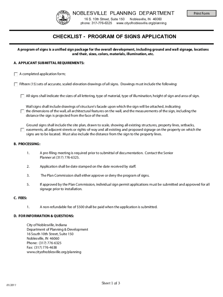 NOBLESVILLE PLANNING DEPARTMENTPrint Form16 S. 10th Street, Suite 150 Noblesville, IN 46060 phone: 3177766325 www.cityofnoblesville.org/planningCHECKLIST PROGRAM OF SIGNS APPLICATION A program of