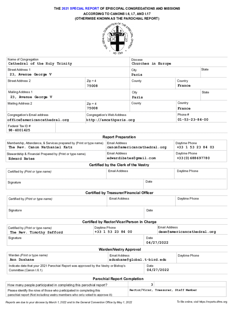 THE 2021 SPECIAL REPORT OF EPISCOPAL CONGREGATIONS AND MISSIONS ACCORDING TO CANONS I.6, I.7, AND I.17 (OTHERWISE KNOWN AS THE PAROCHIAL REPORT)Name of CongregationDioceseCathedral of the Holy TrinityChurches