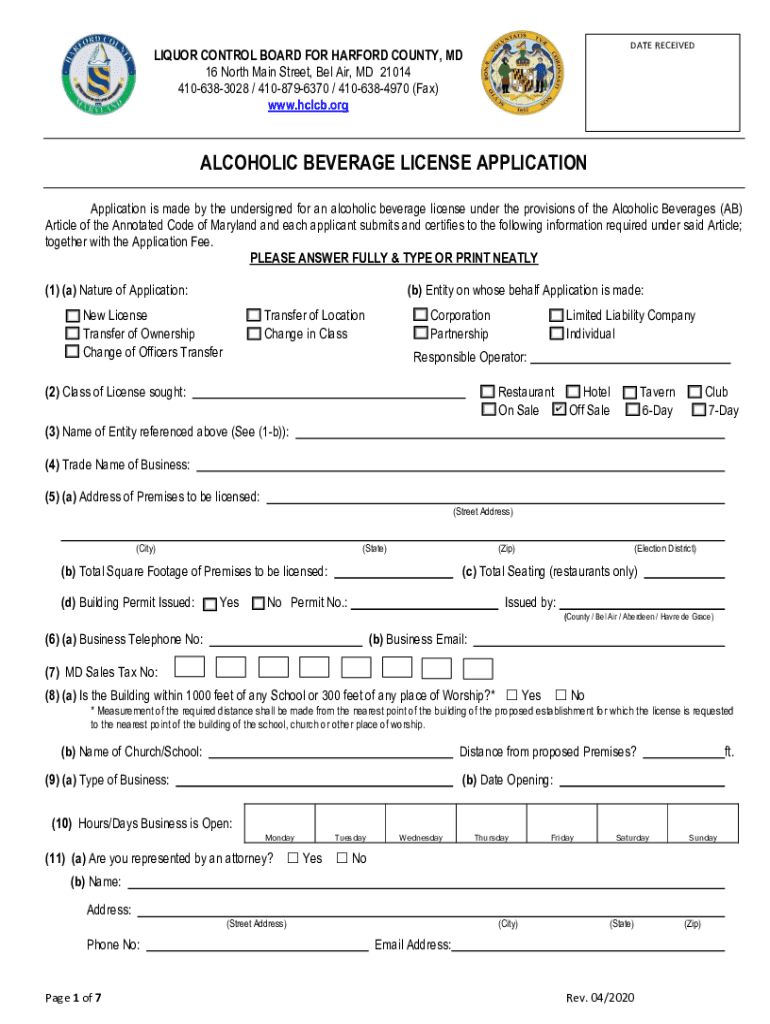 DATE RECEIVEDLIQUOR CONTROL BOARD FOR HARFORD COUNTY, MD 16 North Main Street, Bel Air, MD 21014 4106383028 / 4108796370 / 4106384970 (Fax) www.hclcb.orgALCOHOLIC BEVERAGE LICENSE APPLICATION is made