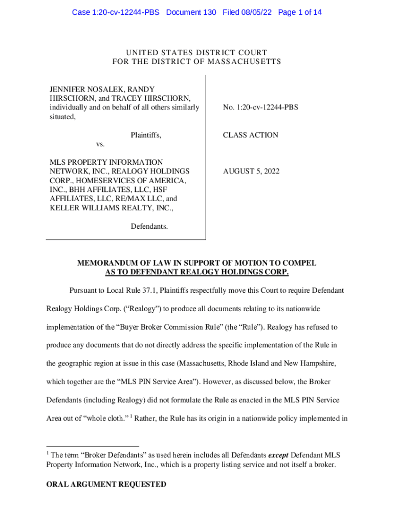 Case 1:20cv12244PBS Document 130 Filed 08/05/22-Page 1 of 14UNITED STATES DISTRICT COURT FOR THE DISTRICT OF MASSACHUSETTSJENNIFER ROSALES, RANDY HIRSCHMAN, and TRACEY HIRSCHMAN, individually and