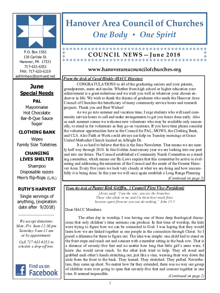 Hanover Area Council of Churches One Body One Spirit P.O. Box 1561 136 Carlisle St. Hanover, PA 17331 7176336353 FAX: 7176336219 adminhacc@comcast.netJune Special Needs PAL Mayonnaise Hot Chocolate