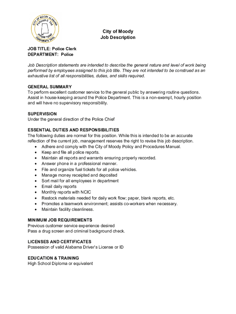 City of Moody Job Description JOB TITLE: Police Clerk DEPARTMENT: Police Job Description statements are intended to describe the general nature and level of work being performed by employees assigned