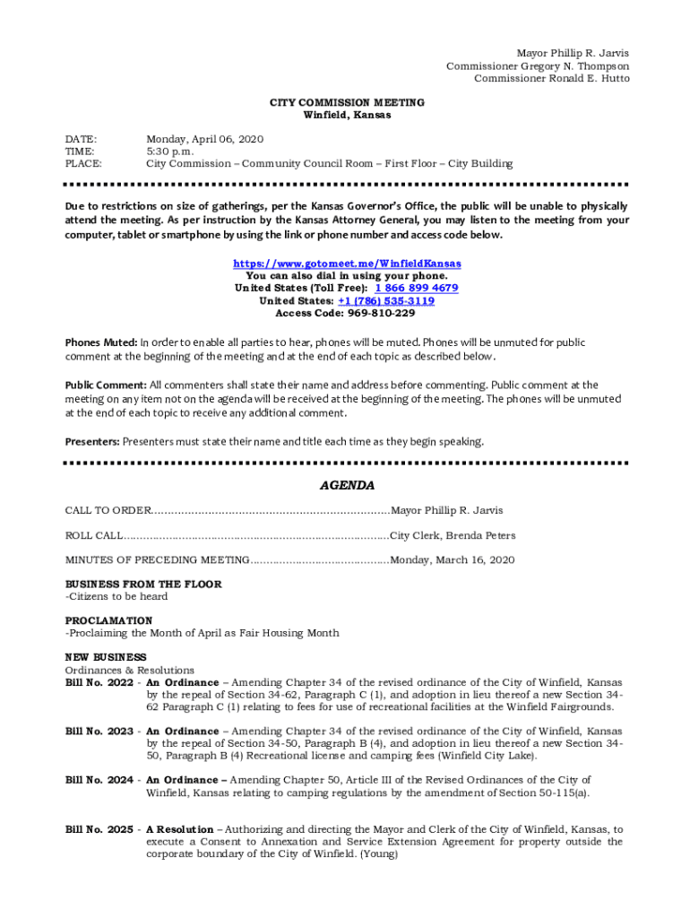 Mayor Phillip R. Jarvis Commissioner Gregory N. Thompson Commissioner Ronald E. Bhutto CITY COMMISSION MEETING Winfield, Kansas DATE: TIME: PLACE:Monday, April 06, 2020 5:30 p.m. City Commission Community