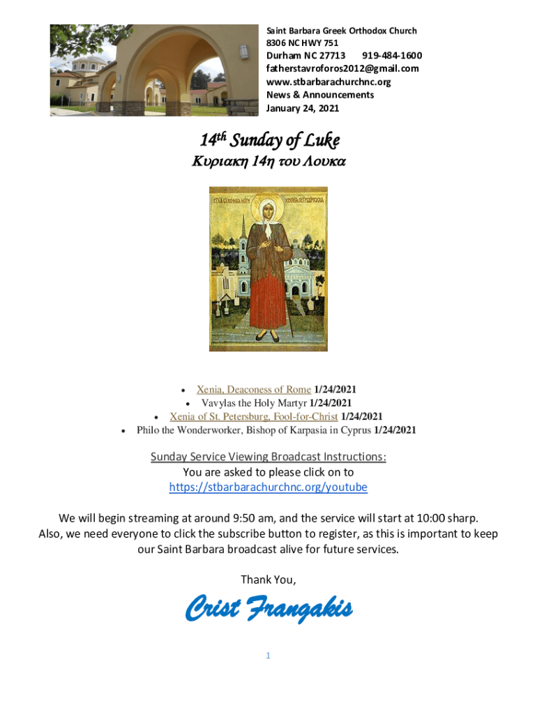 Saint Barbara Greek Orthodox Church 8306 NC HWY 751Durham NC 27713 9194841600 fatherstavroforos2012@gmail.com www.stbarbarachurchnc.org News & Announcements January 24, 202114th Sunday of Luke Xenia,