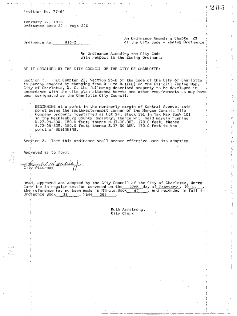 205Petition No. 7754 February 27, 1978\' Ordinance Book 25 Page 205Ordinance No. \'\' 910ZAn Ordinance Amending Chapter 23 of the City Code Zoning Ordinance Amending the City Code with respect to
