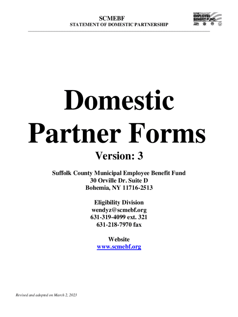SCM EBF STATEMENT OF DOMESTIC PARTNERSHIPDomestic Partner Forms Version: 3 Suffolk County Municipal Employee Benefit Fund 30 Orville Dr. Suite D Bohemia, NY 117162513 Eligibility Division wendyz@scmebf.org