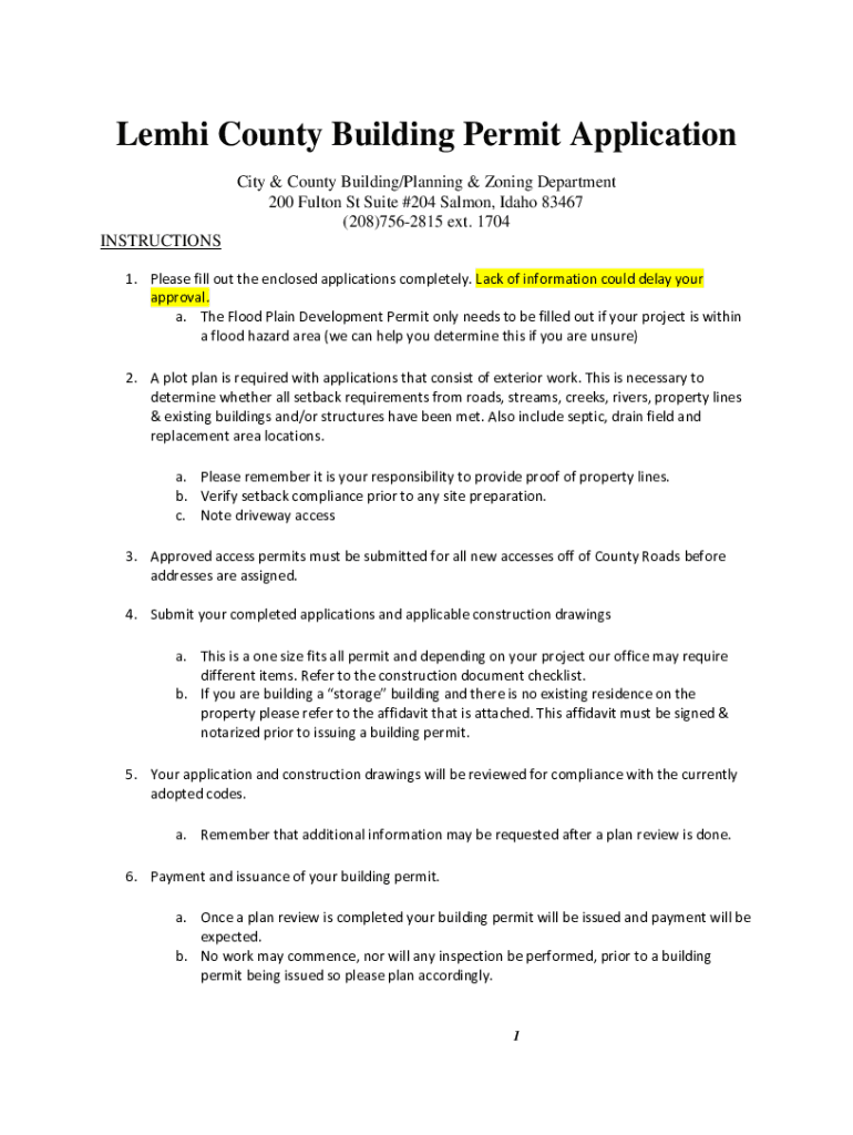 Semi County Building Permit Application City & County Building/Planning & Zoning Department 200 Fulton St Suite #204 Salmon, Idaho 83467 (208)7562815 ext. 1704 INSTRUCTIONS 1. Please fill out the