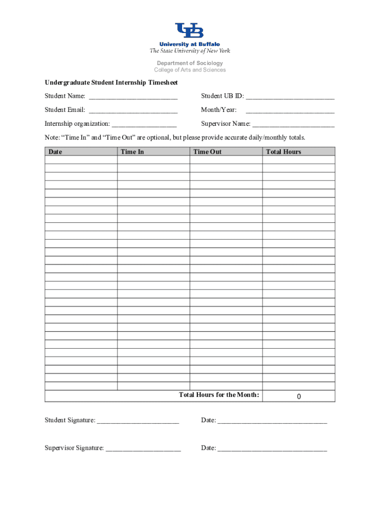 Department of Sociology College of Arts and SciencesUndergraduate Student Internship Timesheet Student Name: ___Student UP ID: ___Student Email: ___Month/Year:Internship organization: ___Supervisor