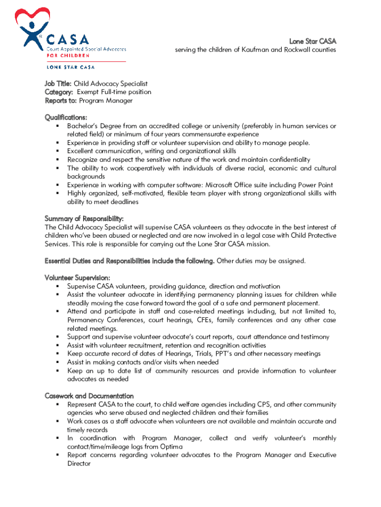 Lone Star CASA serving the children of Kaufman and Rockwell counties Job Title: Child Advocacy Specialist Category: Exempt Full time position Reports to: Program Manager Qualifications: Bachelors