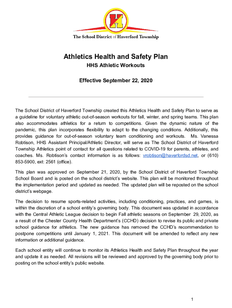 Athletics Health and Safety Plan HHS Athletic Workouts Effective September 22, 2020The School District of Haverford Township created this Athletics Health and Safety Plan to serve as a guideline for