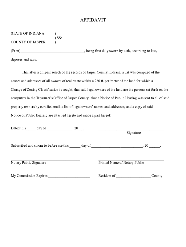 AFFIDAVIT STATE OF INDIANA COUNTY OF JASPER)) SS:)(Print)___, being first duly sworn by oath, according to law, deposes and says; That after a diligent search of the records of Jasper County, Indiana,