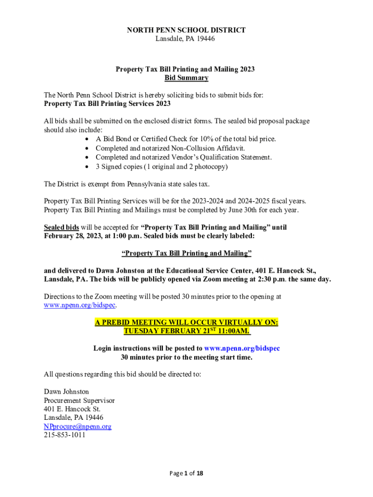 NORTH PENN SCHOOL DISTRICT Lawndale, PA 19446Property Tax Bill Printing and Mailing 2023 Bid Summary The North Penn School District is hereby soliciting bids to submit bids for: Property Tax Bill
