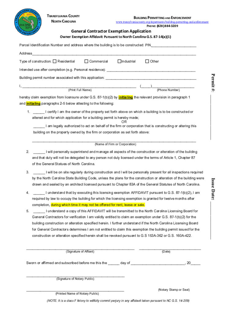 TRANSYLVANIA COUNTY NORTH CAROLINABUILDING PERMITTING AND ENFORCEMENT www.transylvaniacounty.org/departments/buildingpermittingandenforcementPHONE: (828) 8843209General Contractor Exemption Application