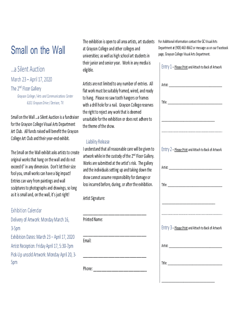 Small on the Wall a Silent Auction March 23 April 17, 2020, The 2nd Floor Gallery Grayson College / Arts and Communications Center 6101 Grayson Drive / Denison, TX Small on the Wall a Silent Auction