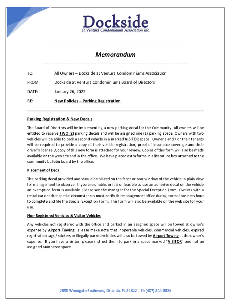 Memorandum TO:All Owners Dockside at Ventura Condominiums AssociationFROM:Dockside at Ventura Condominiums Board of Directorate:January 26, 2022RE:New Policies Parking RegistrationParking Registration
