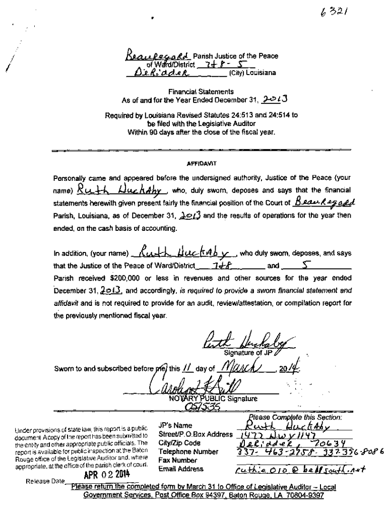 ^3^//fsuijLjJf.sfUL/tJi Parish Justice of the Peace of Wed/District 7 ^ ^ ^ UJLUCdLdj^R^ (City) Louisiana/ Financial Statements As of and for the Year Ended December 31, 2 : ^ J L ^ Required by Louisiana