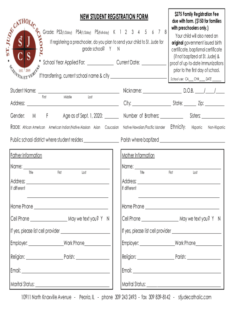 NEW STUDENT REGISTRATION FORM Grade: PS3(1/2day)PS4(1/2day)PS(Full day)K12345678If registering a preschooler, do you plan to send your child to St. Jude for grade school? Y School Year Applied For: