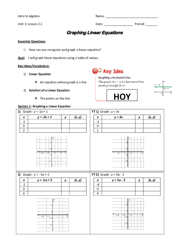 Intro to AlgebraName: ___Unit 2: Lesson 2.1Date: ___ Period: ___Graphing Linear Equations Essential Questions:show can you recognize and graph a linear equation? Goal: I will graph linear equations
