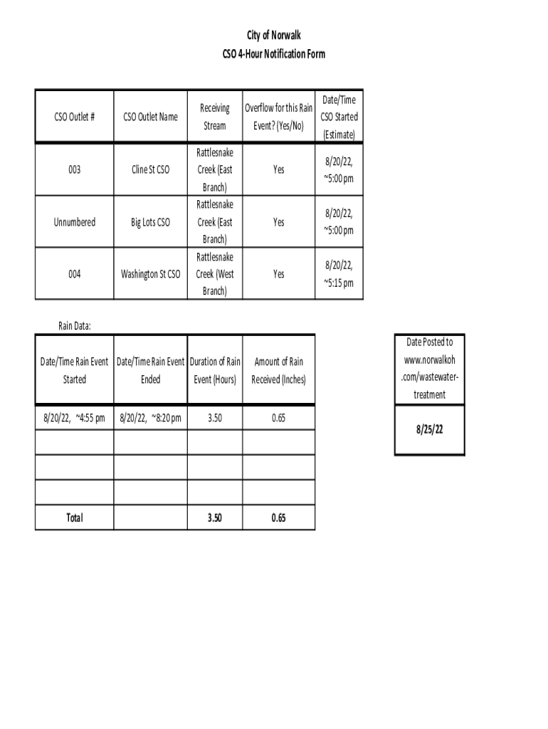 City of Norwalk CSO 4Hour Notification Forms Outlet #CSO Outlet Name003Cline St CSOUnnumberedBig Lots CSO004Washington St Receiving Stream Rattlesnake Creek (East Branch) Rattlesnake Creek (East Branch)