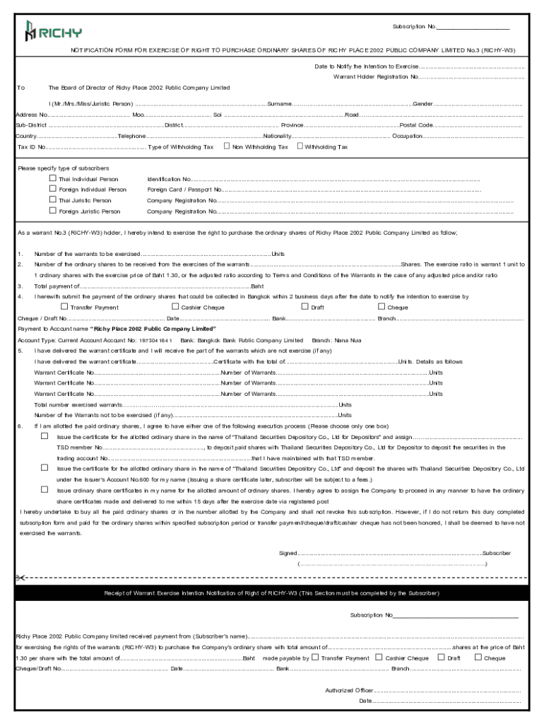 Subscription No.___ NOTIFICATION FORM FOR EXERCISE OF RIGHT TO PURCHASE ORDINARY SHARES OF RICH PLACE 2002 PUBLIC COMPANY LIMITED No.3 (RICHYW3) Date to Notify the Intention to Exercise................................................................