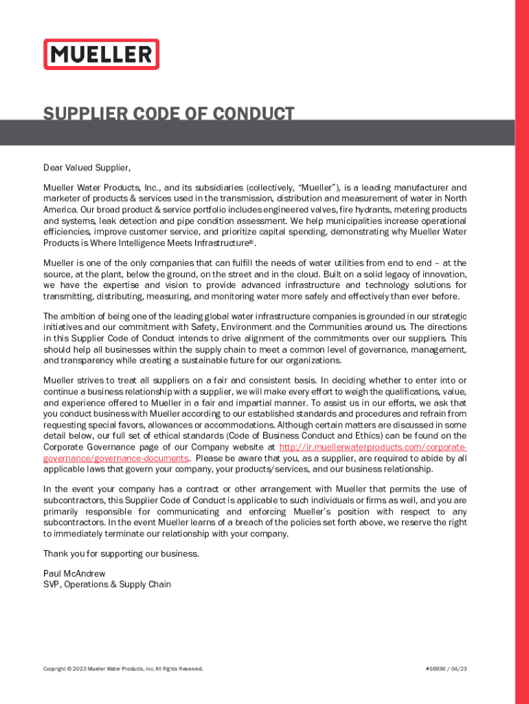 SUPPLIER CODE OF CONDUCT Dear Valued Supplier, Mueller Water Products, Inc., and its subsidiaries (collectively, Mueller), is a leading manufacturer and marketer of products & services used in the