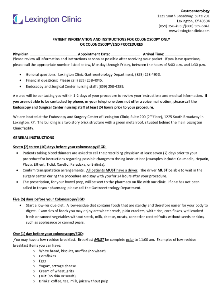 Gastroenterology 1225 South Broadway, Suite 201 Lexington, KY 40504 (859) 2584950/(800) 5656841 www.lexingtonclinic.com PATIENT INFORMATION AND INSTRUCTIONS FOR COLONOSCOPY ONLY OR COLONOSCOPY/EGD