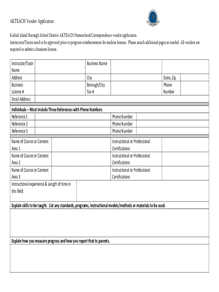 TEACH Vendor Application Kodiak Island Borough School District TEACH Homeschool/Correspondence vendor application Instructors/Tutors need to be approved prior to program reimbursement for student