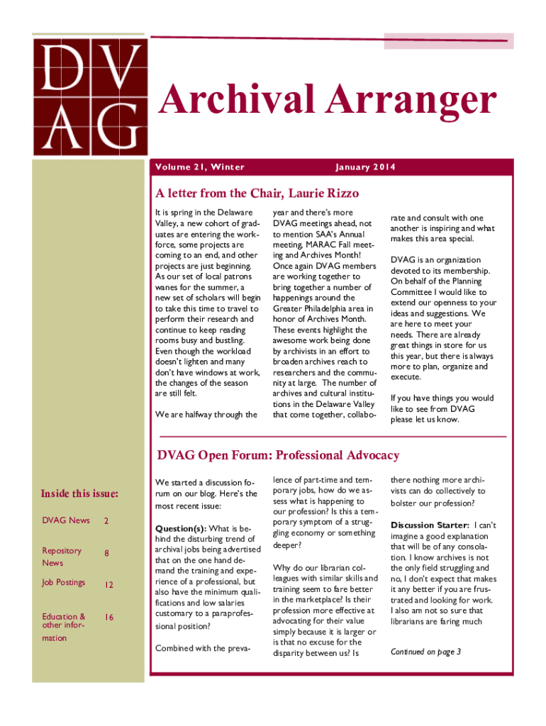 BUSINESS NAMEArchival Arranger Volume 21, Winter January 2014A letter from the Chair, Laurie Rizzo It is spring in the Delaware Valley, a new cohort of graduates is entering the workforce, some projects